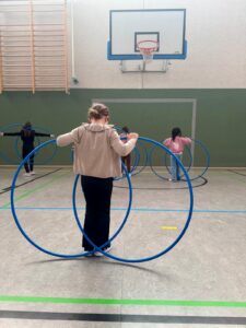 Auch außerhalb der eigenen Zirkusgruppen gab es viel zu erleben: Wenn die Kinder gerade keine Zirkuszeit hatten, konnten sie an verschiedenen Angeboten teilnehmen. In der Pausenhalle gab es zahlreiche Mitmachstationen, an denen Tellerdrehen, Balancieren, Zaubertricks, Ringe werfen und vieles mehr ausprobiert werden konnten. Außerdem hatten alle Klassen die Möglichkeit, eigene Jonglierbälle zu basteln. Ergänzend wurde auch im Unterricht das Thema Zirkus aufgegriffen und auf vielfältige Weise in den Klassen behandelt.
