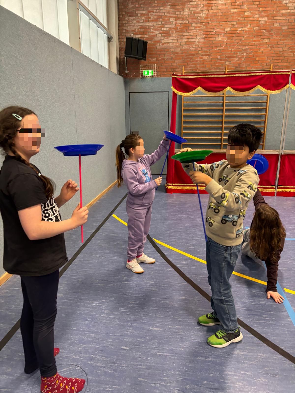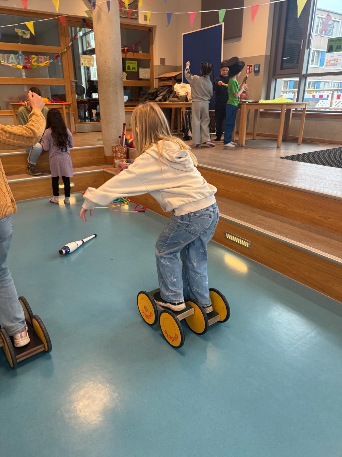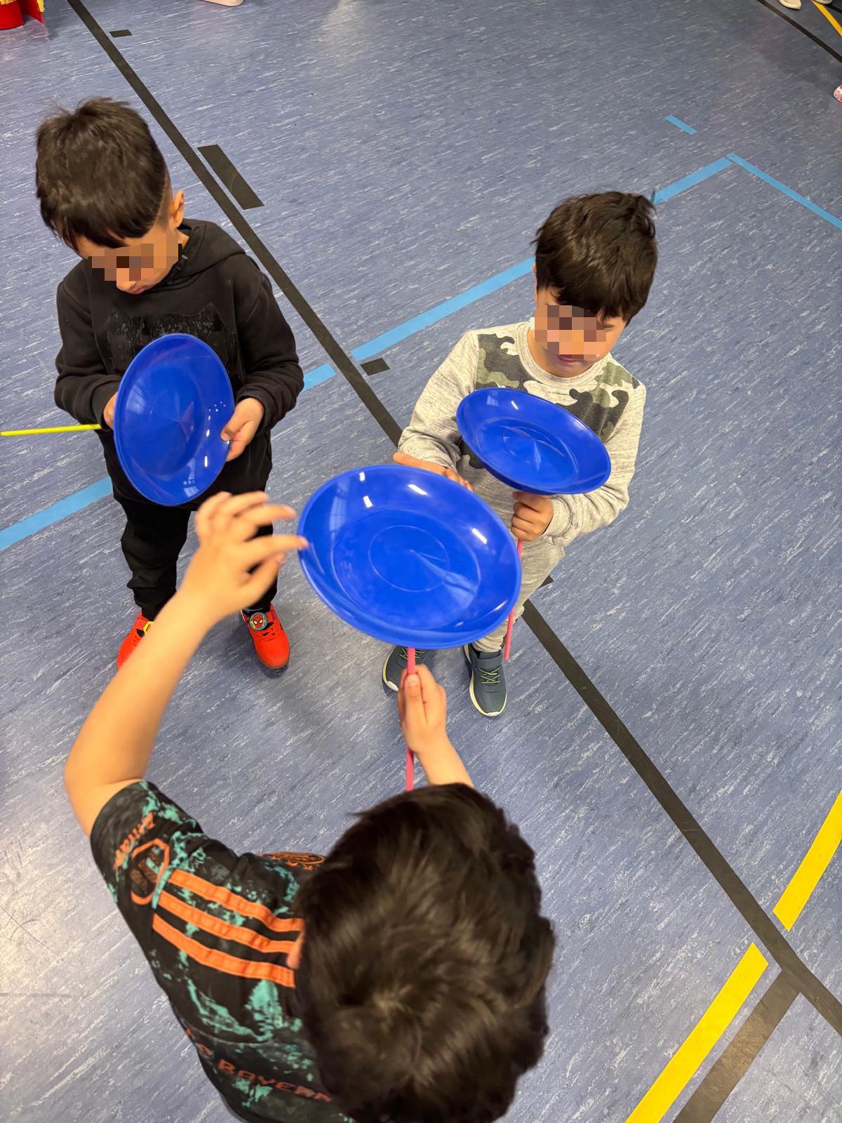 Auch außerhalb der eigenen Zirkusgruppen gab es viel zu erleben: Wenn die Kinder gerade keine Zirkuszeit hatten, konnten sie an verschiedenen Angeboten teilnehmen. In der Pausenhalle gab es zahlreiche Mitmachstationen, an denen Tellerdrehen, Balancieren, Zaubertricks, Ringe werfen und vieles mehr ausprobiert werden konnten. Außerdem hatten alle Klassen die Möglichkeit, eigene Jonglierbälle zu basteln. Ergänzend wurde auch im Unterricht das Thema Zirkus aufgegriffen und auf vielfältige Weise in den Klassen behandelt.