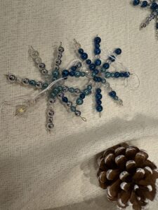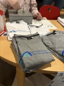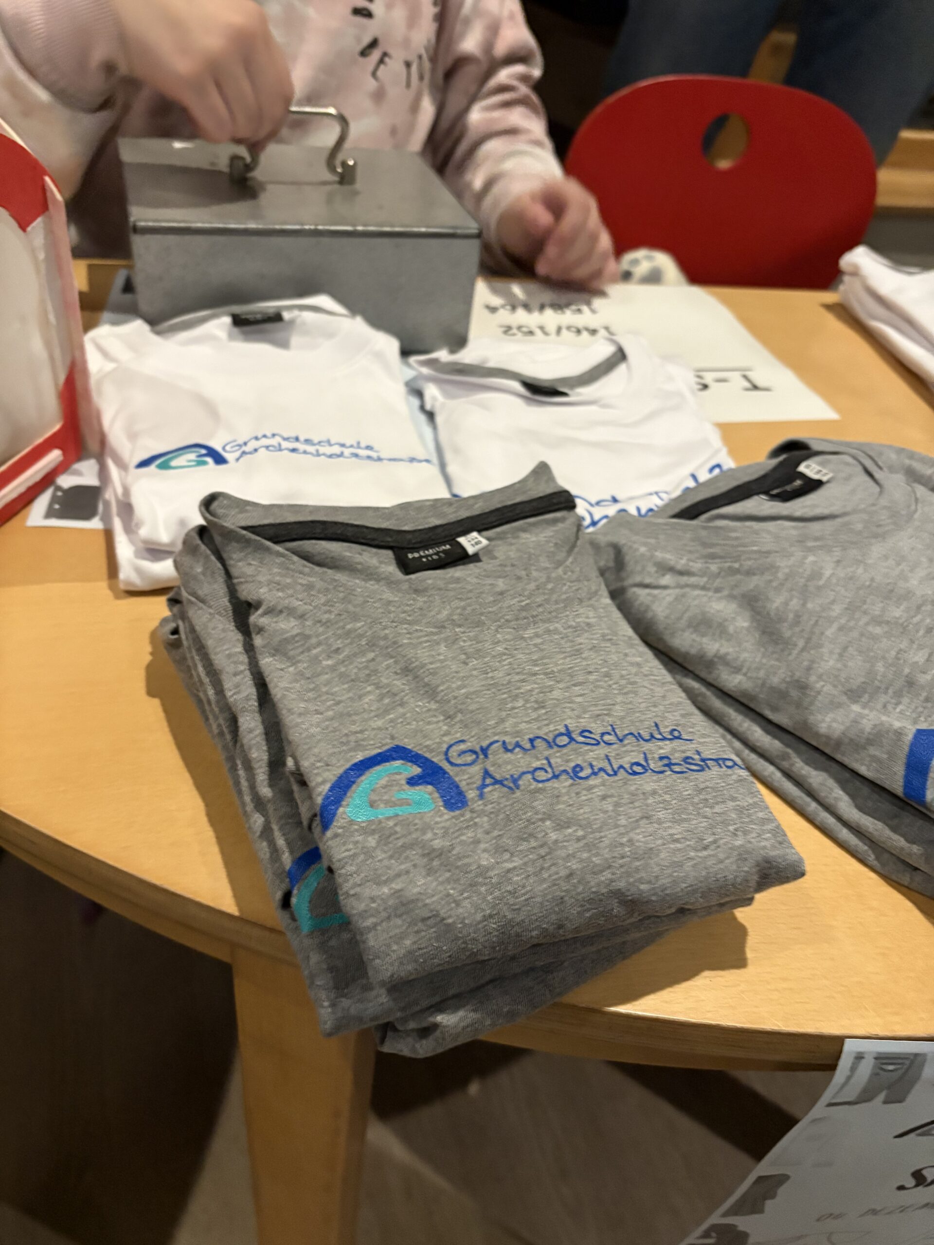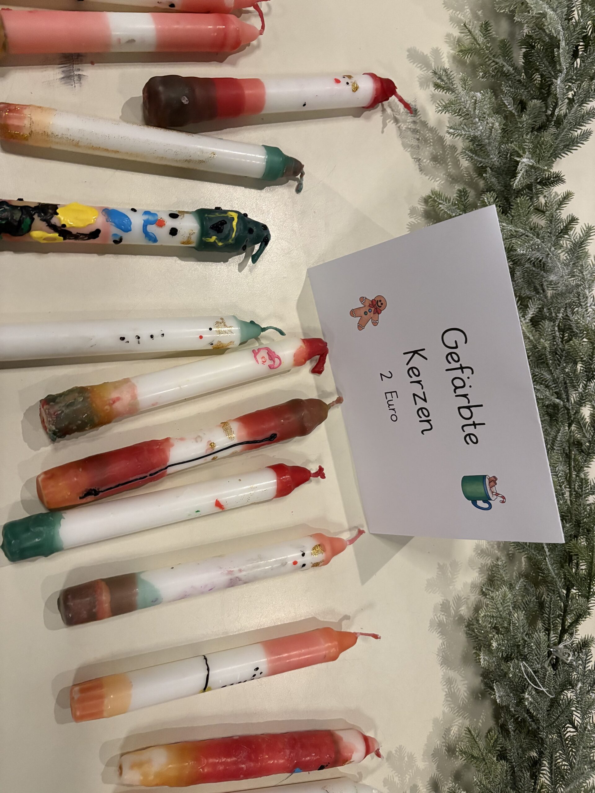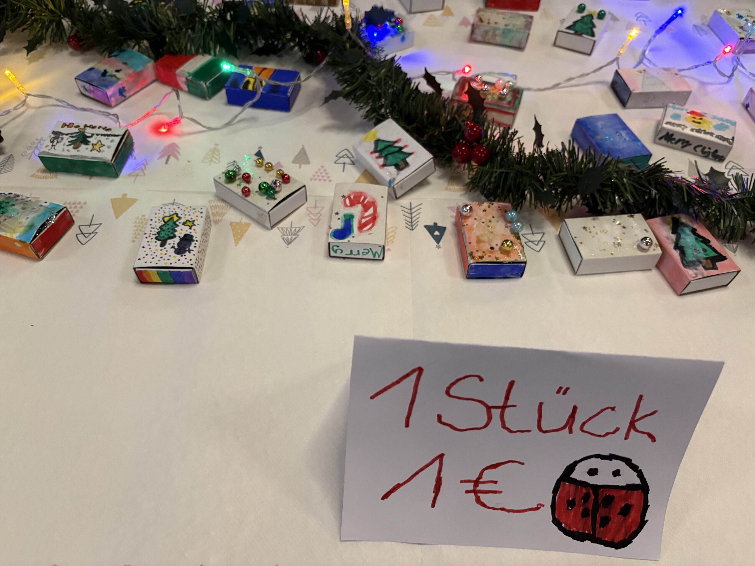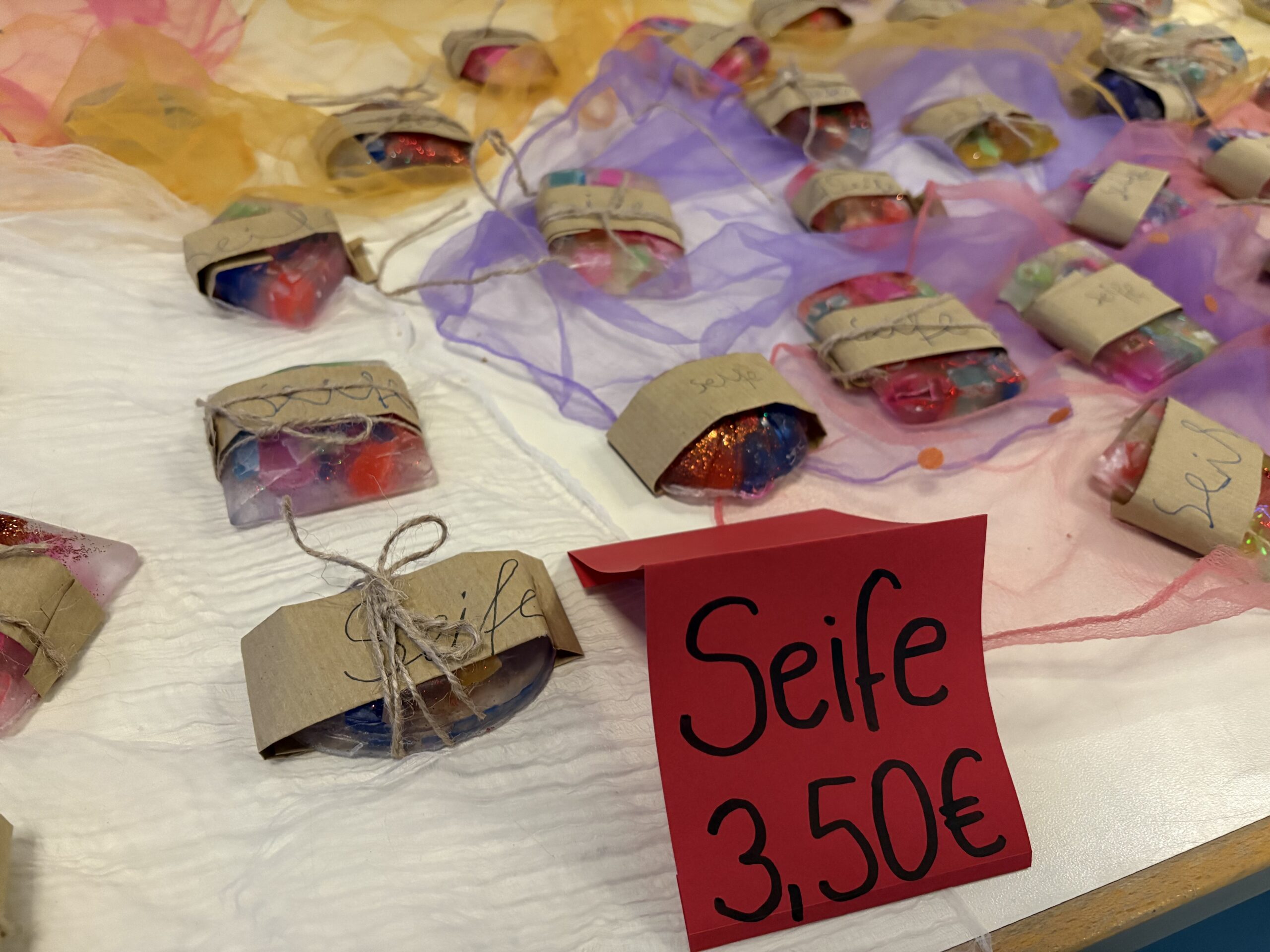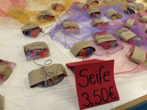 In der Pausenhalle fand unser Bazar statt. Dort wurden viele selbstgemachte Dinge verkauft – zum Beispiel Kerzen, Laternen, Perlensterne, Mini-Weihnachtsbäume to go, Anhänger aus Tannenzapfen, Konfetti-Seife und Kekshäuser. Auch unsere Schulkleidung konnte an einem Stand gekauft werden.